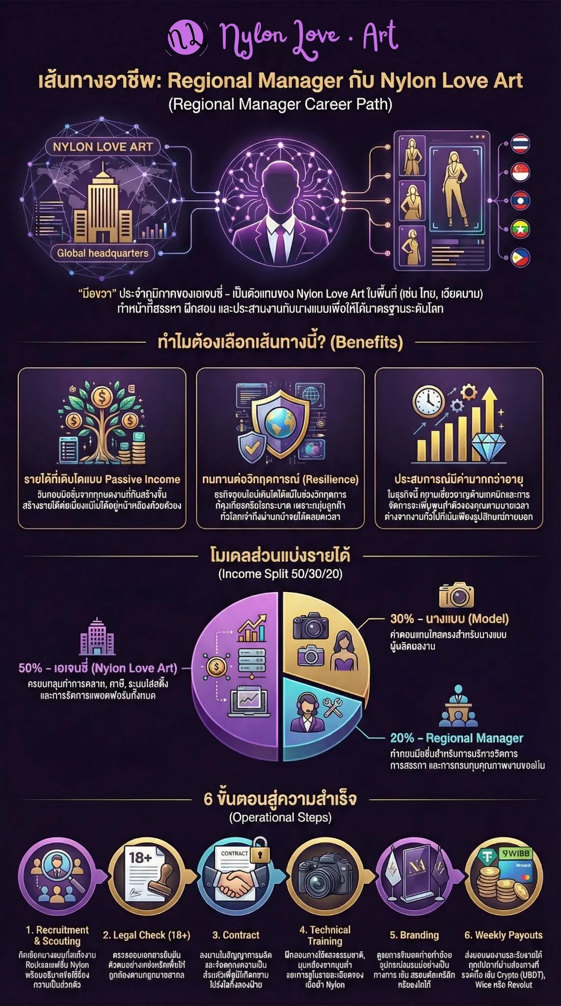 Nylon Love Art เป็นเอเจนซี่ที่มีฐานอยู่ในออสเตรียและเอสโตเนีย ทำหน้าที่เชื่อมโยงระหว่างนางแบบเอเชียที่มีความสามารถกับตลาดระดับโลกในยุโรปและสหรัฐอเมริกา เราจัดเตรียมแพลตฟอร์ม การตลาด และความเชี่ยวชาญทางเทคนิค ส่วนคุณมอบความสามารถของคุณ ภารกิจของเราคือการยกระดับการถ่ายภาพแฟชั่นไนลอนให้เป็นศิลปะ พร้อมกับสร้างอาชีพที่ยั่งยืนให้กับนางแบบทั่วโลก